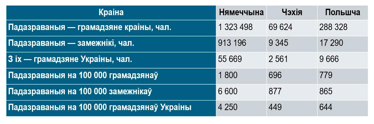 У Польшчы, Чэхіі і Нямеччыне, дзе жыве найбольшая колькасць перасяленцаў з Украіны, статыстыка паказвае: у адных выпадках іх доля крыху вышэй, у іншых — ніжэй, чым сярод мясцовых жыхароў.