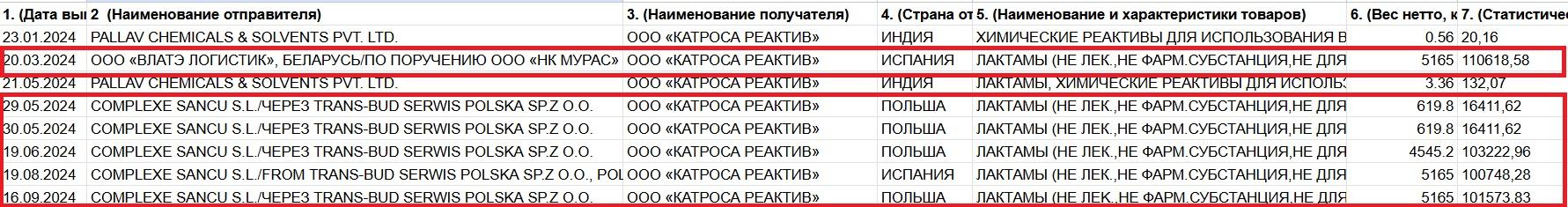 Пасля ўвядзення забароны на экспарт NMP у Расею, у 2023 годзе, паводле звестак расейскай мытні, «Катроса Реактив» набыла каля 16 тонаў N-метыл-2-піралідону. У 2024 годзе — яшчэ 21,3 тоны хімічнага рэчыва пад тым жа таварным кодам, але без пазначэння назвы тавару. З іх 16 тонаў прыйшло ад Complexe Sancu SL. Астатнія 5 тонаў растваральніку даставіла беларускае ТАА «Влатэ Лагістык». [*] [*]