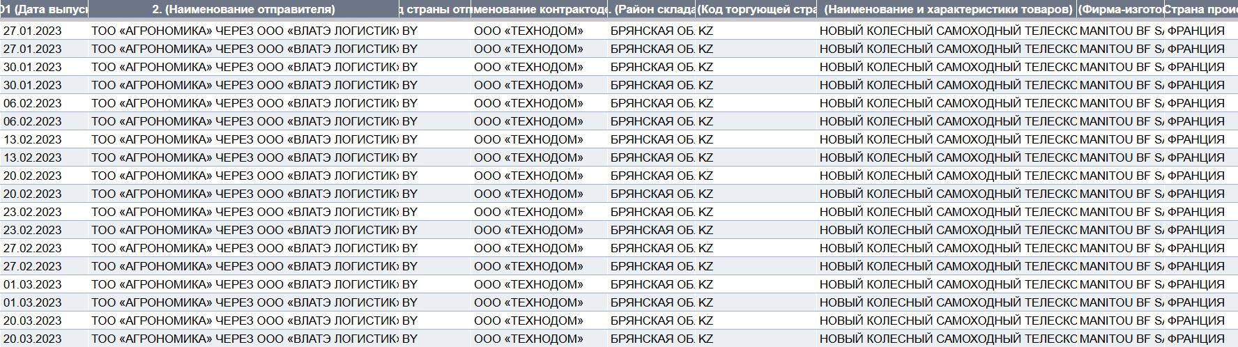 Пры дапамозе «Влатэ Лагістык» Расея ў 2023 годзе атрымала партыю пагрузчыкаў французскага вытворцы Manitou. Яна нібыта везла тэхніку праз Беларусь казахстанскаму ТАА «Агрономика», якое зарэгістравалі ў красавіку 2022 года, праз месяц пасля таго, як ЕЗ забараніў экспарт пагрузчыкаў у Беларусь. Аднак гэтая кампанія змяніла месца прызначэння тавару і даручыла беларускай фірме даставіць яго ў Бранскую вобласць. ТАА «Технодом» — канчатковы атрымальнік тэхнікі, пастаўленай праз казахстанскую кампанію-пракладку ў Расею, — па гэтай схеме набыло пагрузачных машынаў на $1,8 млн. [*]