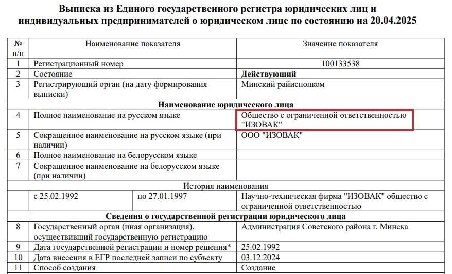 The current director of I-Photonics, Vitaly Khomich, was, at least in 2020, the deputy director of Izovac — a Belarusian company within the group. Additionally, according to data from the Cyber Partisans, there are records of social security contributions (FSZN) from Izovac on behalf of Khomich up until September 2024. [*]