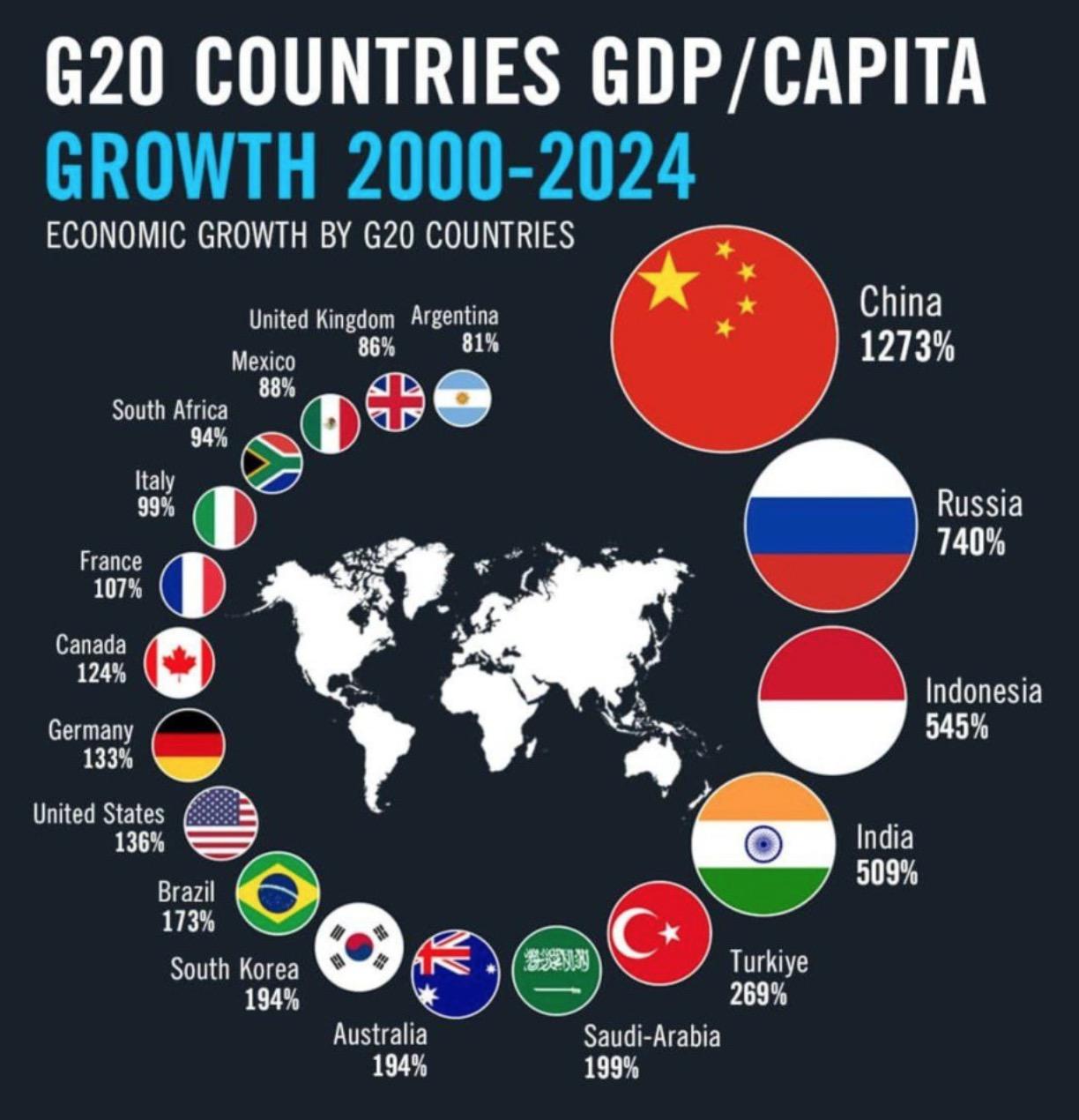 «С 2000 по 2024 год страны G20 показали разную динамику экономического развития. На фоне общего роста выделяется Россия, которая, несмотря на 11 лет непрерывных санкций против ключевых компаний, заняла второе место по росту ВВП на душу населения среди всех стран “двадцатки”», — написано в заметке портала AsiaToday.