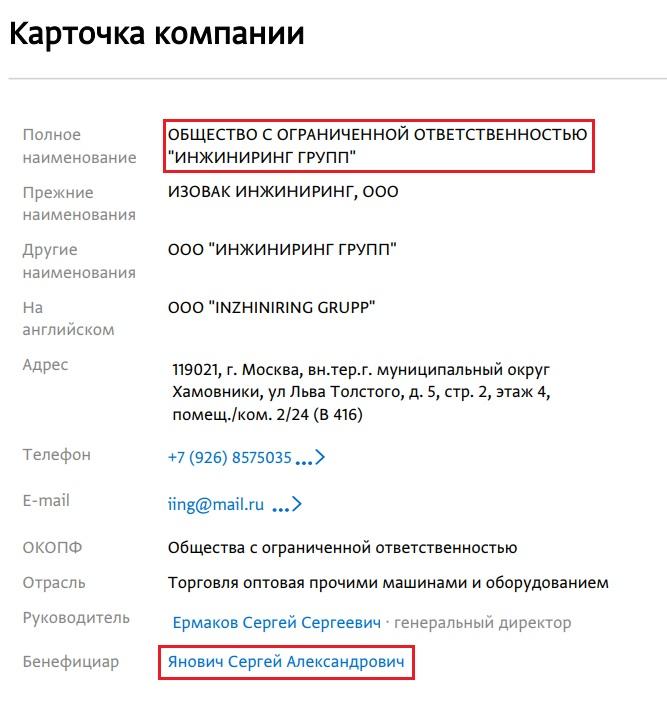 «Инжиниринг Групп» привлекла внимание БРЦ не только связями с российской оборонной промышленностью. Владелец компании с апреля 2022 года — беларус Сергей Янович. [*] [*] По данным «Киберпартизан», по совместительству Янович был сотрудником беларусского «Изовак» как минимум до 2024 года. [*] До июня 2023-го «Инжиниринг Групп» называлась «Изовак Инжиниринг». На ее сайте говорилось, что фирма является официальным представительством «Изовака» в России, а директор российской компании использовал почту на домене izovac.com как минимум до 2024 года. [*] [*]