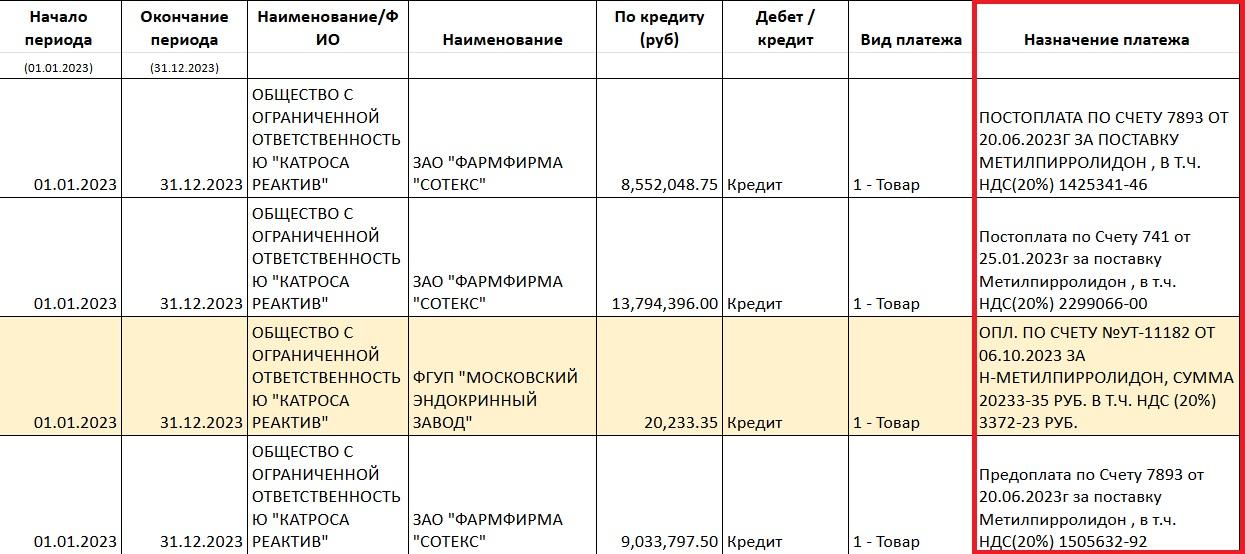 Кому российская компания продавала вещество, которое и краску растворяет, и для производства химоружия годится? «Катроса Реактив» в 2023–2024 годах, по данным банковских операций, поставила NMP на $1,3 млн фармацевтической компании ЗАО «Фармфирма “Сотекс”» и ФГУП «Московский эндокринный завод». В документах указаны только суммы сделок без массы химиката, поэтому мы не можем точно определить, сколько тонн вещества фактически купили фармкомпании. [*]