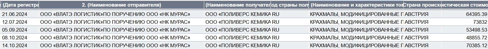 Кроме этого, «ВЛАТЕ Логистик» по поручению упомянутой выше «НК Мурас» в 2024 году завезла в Россию модифицированные крахмалы из Австрии, которые используют для производства строительных смесей, на $311 тыс. Евросоюз запретил их экспорт в РФ в феврале 2023-го. [*]