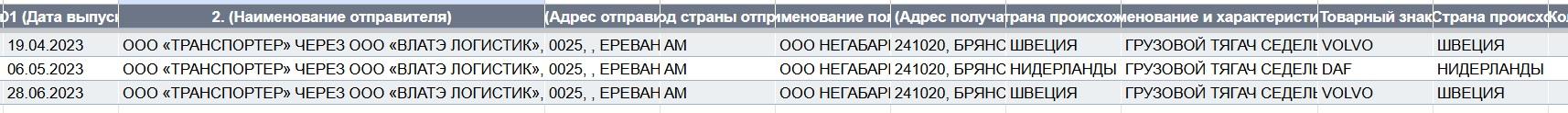 На $196 тыс. благодаря «ВЛАТЕ Логистик» Россия в 2023 году получила подсанкционных грузовиков Volvo и DAF из Швеции и Нидерландов. В этом случае цепочка запретных поставок проходила через Армению. В таможенных декларациях, которые есть в нашем распоряжении, отправителем указано армянское ООО «Транспортер». Но нам не удалось найти в этой стране такую фирму. Возможно, «ВЛАТЕ Логистик», чтобы обойти ограничения, указала несуществующую армянскую компанию. [*]