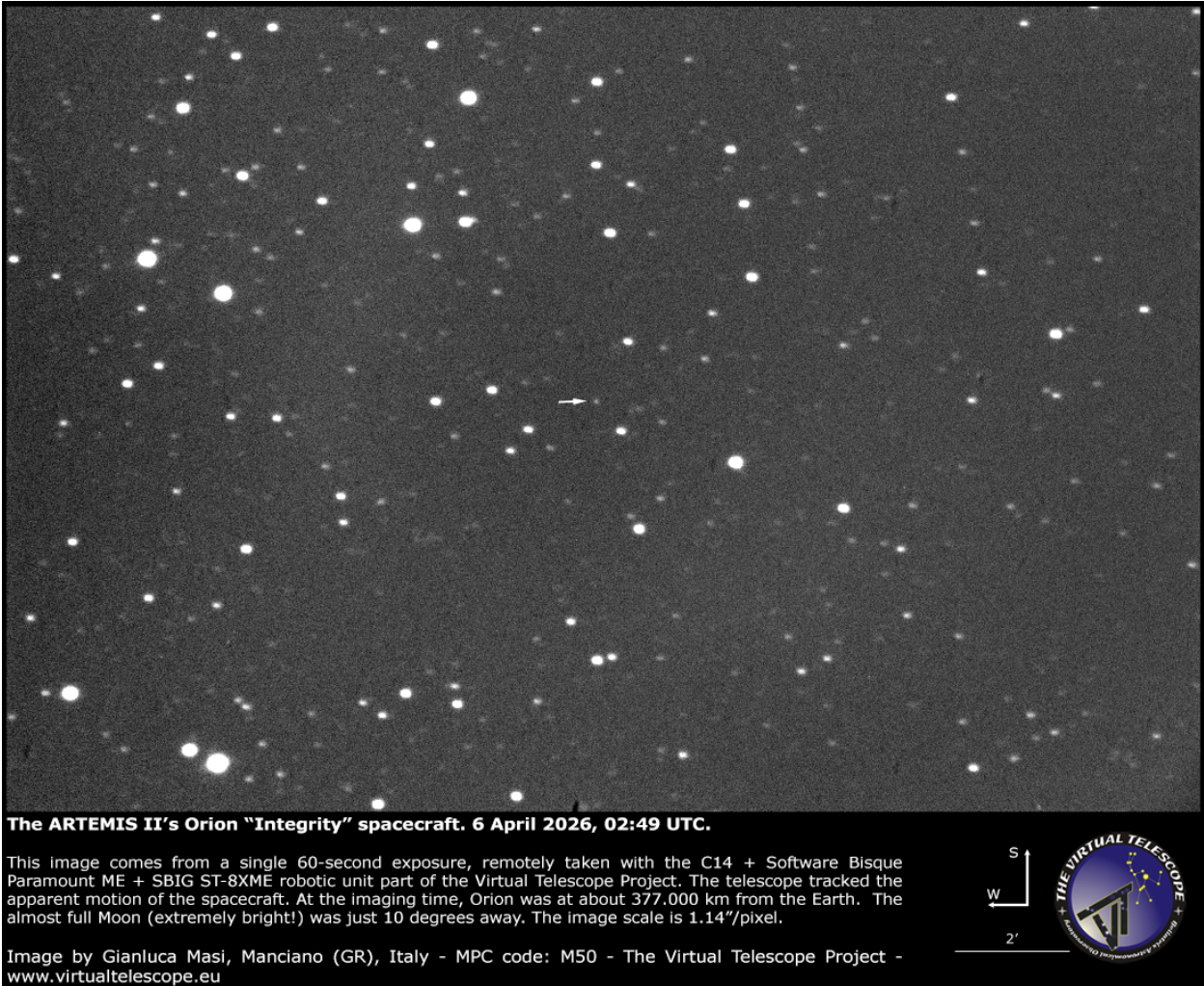 Крыніца: The Virtual Telescope Project. Касмічны карабель «Арыён» місіі «Артэміда-2». 6 красавіка 2026 года.