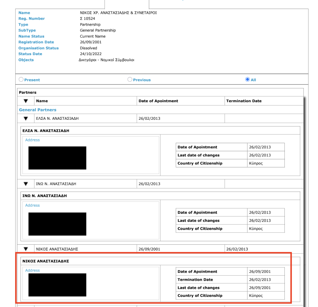 Наўрад ці сям’я Анастасіядыса можа спаслацца на няведанне санкцыйных законаў. Юрыдычным кансультантам Profax на момант апісаных вышэй транзакцыяў была фірма Nicos Chr Anastasiades & Partners. Яе ў 2001 годзе заснаваў сам Нікас Анастасіядыс і выйшаў са складу ўласнікаў толькі за два дні да свайго прывядзення да прысягі на пасаду прэзідэнта Кіпра ў лютым 2013-га. Партнёрамі ў юрыдычнай кампаніі да моманту ліквідацыі ў 2022 годзе заставаліся дочкі экс-прэзідэнта Кіпра Эльза ды Іно Анастасіядыс, а таксама Стасіс Леміс ды Тэафаніс Філіпоў (абодвух мы згадвалі вышэй як партнёраў дачкі прэзідэнта па кампаніі Imperium Nominees). [*] [*] [*]