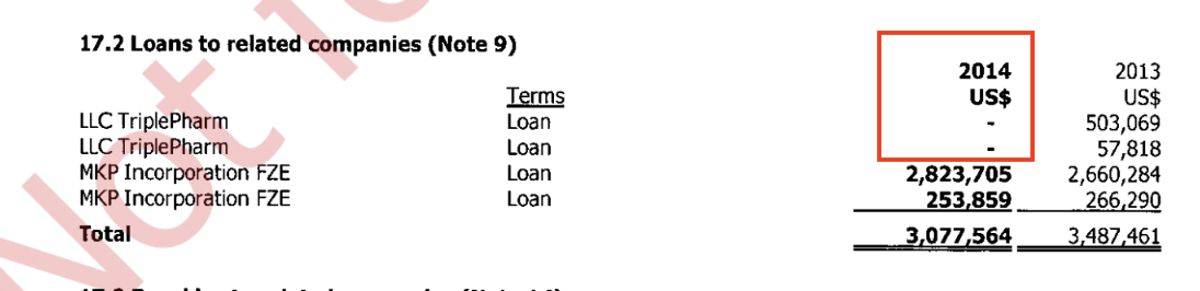 У фінансавых справаздачах кіпрскіх уласніц «ТрайплФарм» мы бачым прыкметы магчымага ўзаемадзеяння з іх падсанкцыйным беларускім актывам. У прыватнасці, у 2013 годзе «ТрайплФарм» мела запазычанасці перад Profax, а ў 2014-м запазычанасці зніклі. У справаздачы Profax за той жа год мы бачым паступленне грошай ад вяртання гэтых пазык. Выглядае, што беларуская падсанкцыйная кампанія выплаціла грошы сваёй еўрапейскай уласніцы. [*] [*]