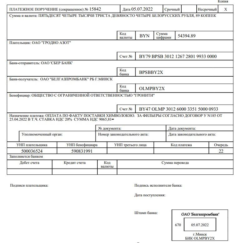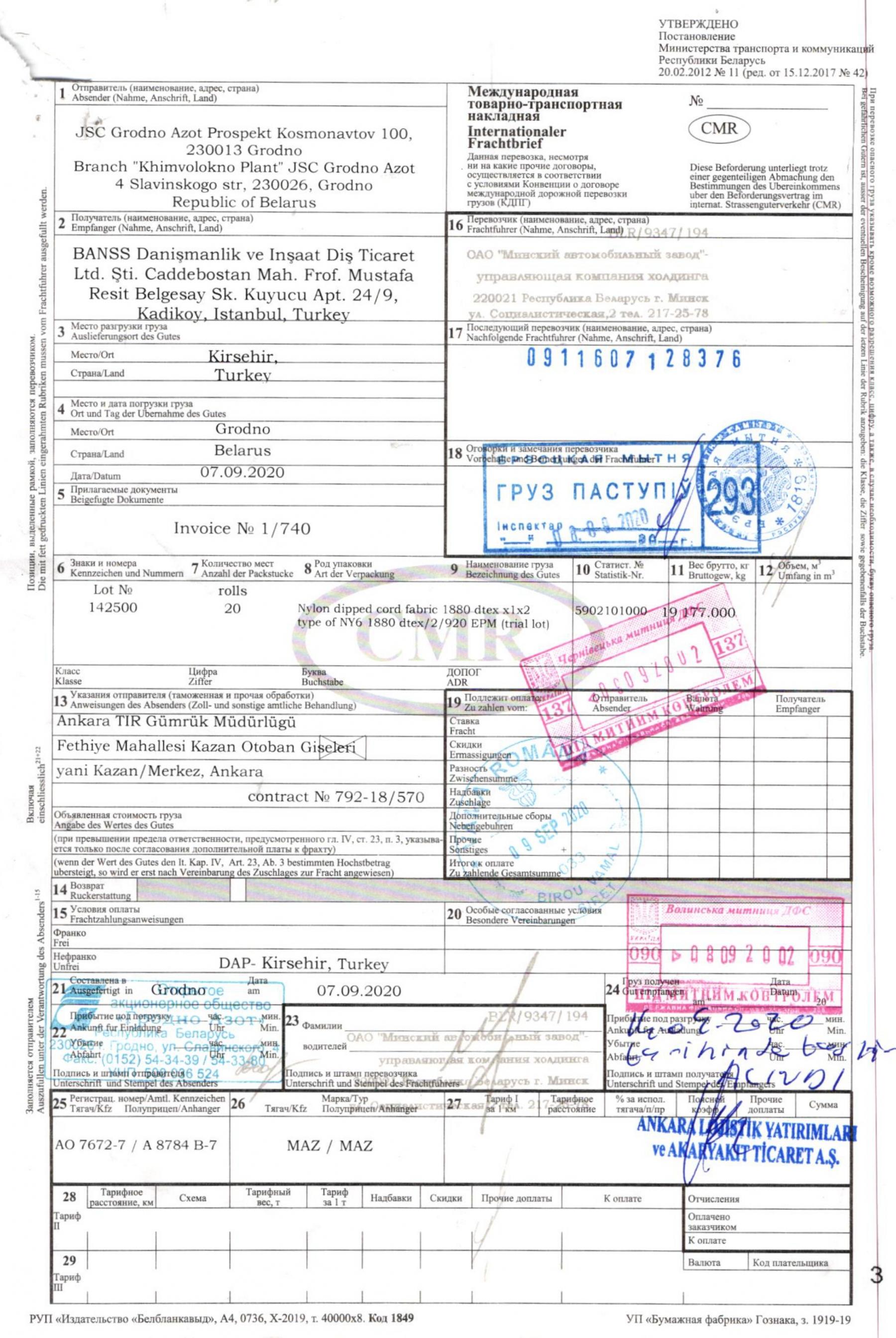 І іншы спосаб знайшоўся. З таварнай накладной за травень 2022 года, якую БРЦ атрымаў ад «Рабочага Руху», вынікае, што «Гродна Азот» усё ж набыў фільеры, але праз пасярэднікаў. Першым была турэцкая фірма Banss danişmanlik ve i̇nşaat diş ti̇caret li̇mi̇ted şi̇rketi̇. Яна набыла дэталі ў Tetran і перапрадала іх ТАА «Гроніці» — знаёмаму нашым чытачам па першай частцы гэтага расследавання (кампанія пастаўляе ў ЕЗ поліамід «Заводу Хімвалакно», філіялу «Гродна Азота», пад выглядам сваёй прадукцыі, дапамагаючы такім чынам абысці санкцыі). [*] [*] [*] Урэшце «Гроніці» прадала фільеры сапраўднаму пакупніку — «Гродна Азоту». [*]