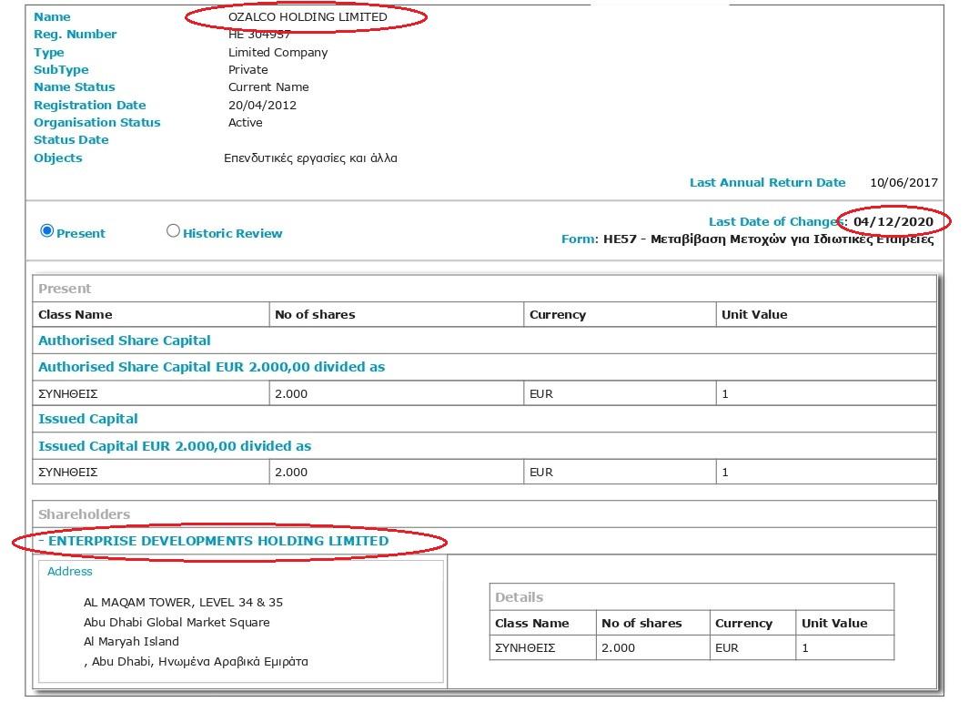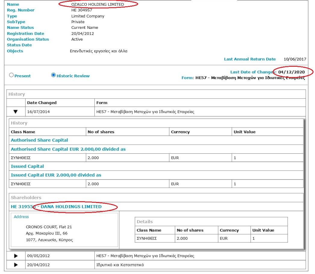 За два тыдні да 17 снежня 2020 (даты ўвядзення санкцыяў Еўразвязам) Dana Holdings прадае пяць кіпрскіх фірмаў эмірацкай кампаніі Enterprise Developments Holding.
