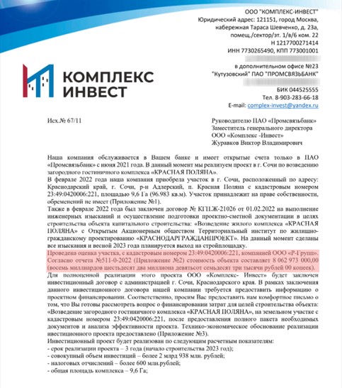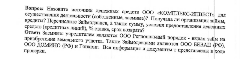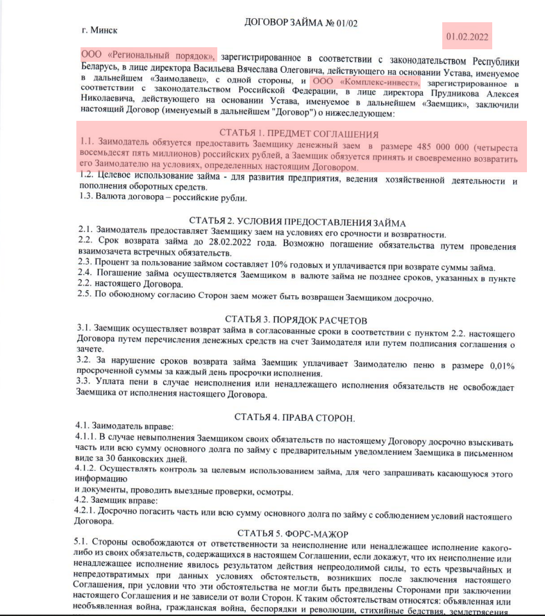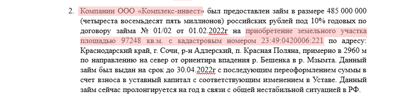 За 17 дзён да куплі ўчастку ў пасёлку «Красная Поляна» «Комплекс-Инвест» атрымаў пазыку ад беларускага ТАА «Рэгіянальны Парадак». [*] [*] Сума пазыкі дакладна супадае з коштам, па якім 18 лютага 2022-га прадалі зямлю пад Сочы, — больш за $6 млн. Кіраваў кампаніяй на той момант грамадзянін Беларусі Вячаслаў Васільеў. У сваім расследаванні BelPol паведаміў, што Васільеў — супрацоўнік адзінай у Беларусі прыватнай ахоўнай кампаніі з правам насіць зброю «Гардсэрвіс». І «Гардсэрвіс», і «Рэгіянальны парадак» — кампаніі, звязаныя з экс-кіруючым справамі Лукашэнкі Віктарам Шэйманам.