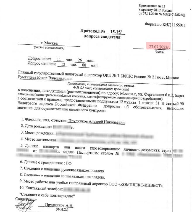 Вызначылі мы і адкуль фірма «Комплекс-Инвест», якая, па дакументах, не займалася ніякай камерцыйнай дзейнасцю, брала сродкі на будоўлю магчымай рэзідэнцыі Аляксандра Лукашэнкі. Дарэчы, гэтае пытанне турбавала не толькі журналістаў, але і расейскую Федэральную падатковую службу. У ліпені 2023 года на допыт у Маскве выклікалі генеральнага дырэктара «Комплекс-Инвеста» Аляксея Пруднікава. У яго спыталі, адкуль кампанія бярэ сродкі для дзейнасці. Пруднікаў адказаў — пазыкі. [*] [*]