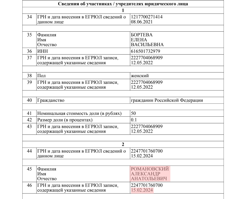 У лютым 2024 года, як даведаўся БРЦ, «Комплекс-Инвест» перапісалі на былога cупрацоўніка Службы бяспекі Аляксандра Лукашэнкі — Аляксандра Раманоўскага. [*] [*] У гэтым жа годзе ён выдаў сваёй новай кампаніі пяць пазыкаў — агулам амаль $4 млн. У рэдакцыі ёсць фактуры і дамовы, якія сведчаць аб пазыках ад пэўных кампаній і людзей на суму не меней за $16,1 млн, але мы маем падставы меркаваць, што грошай было больш — прыблізна $19,5 млн на канец 2024 года.