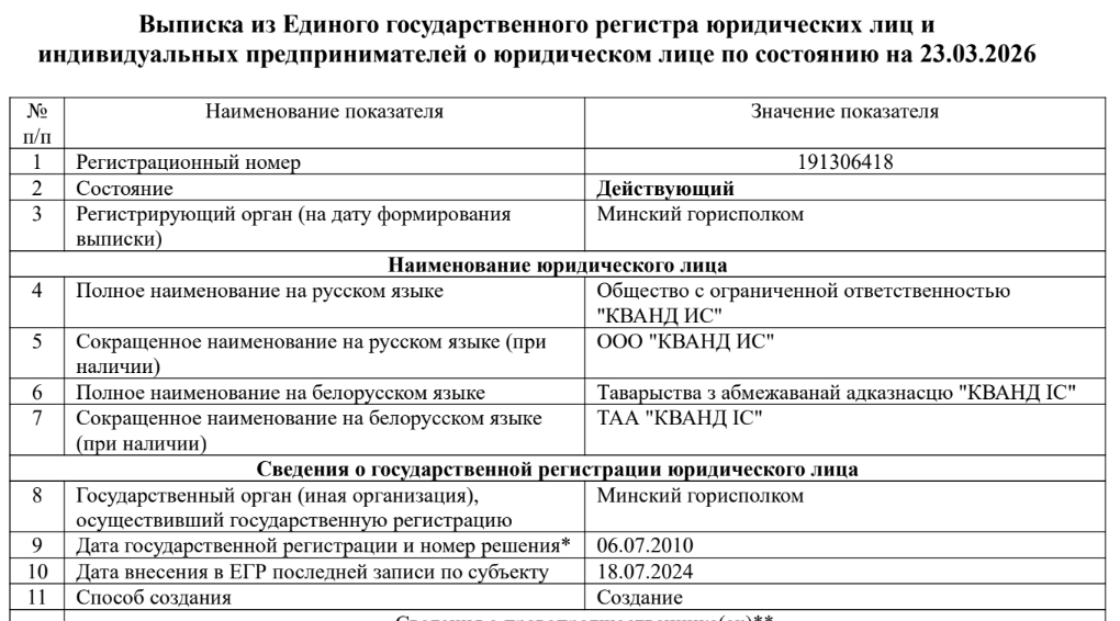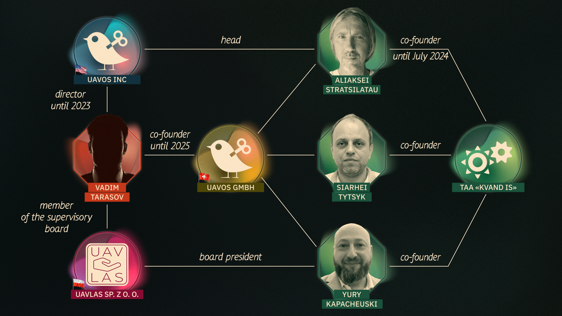 The last in this chain is UAVOS Inc., a U.S.-registered company. Until at least 2023, its director was Vadim Tarasov, a Russian citizen who holds an Israeli passport. He was also a co-founder of the Swiss company UAVOS GmbH until September 2025. At different times, the company was owned by the co-founders of the Belarusian company Kvand IS: Yury Kapacheuski, Aliaksei Stratsilatau (who concurrently serves as head of the American UAVOS), and Siarhei Tytsyk. The US imposed sanctions on Tytsyk in the summer of 2024. As of publication, Tarasov is also a member of the Supervisory Board of UAVLAS Sp. z o.o. based in Poland. [*]