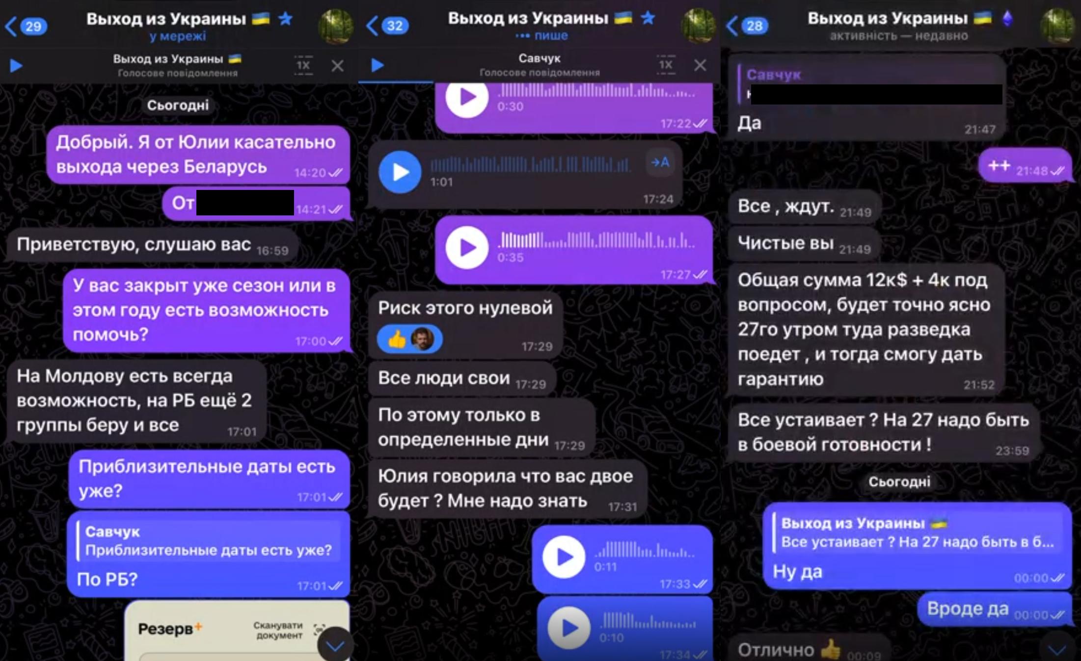 A BIC journalist had a conversation with a representative of one such group on Telegram. The latter offered to buy a proven escape route out of Ukraine, or to pay for a “turnkey” service. This would involve ordering a car with an experienced driver who could bypass Ukrainian checkpoints and take one to the border when “an insider shift” of border guards were on duty in Belarus. The fixer requested $16,000 to help two men leave the country illegally. This cost covers organising an escape to Belarus, followed by travel to the EU.
