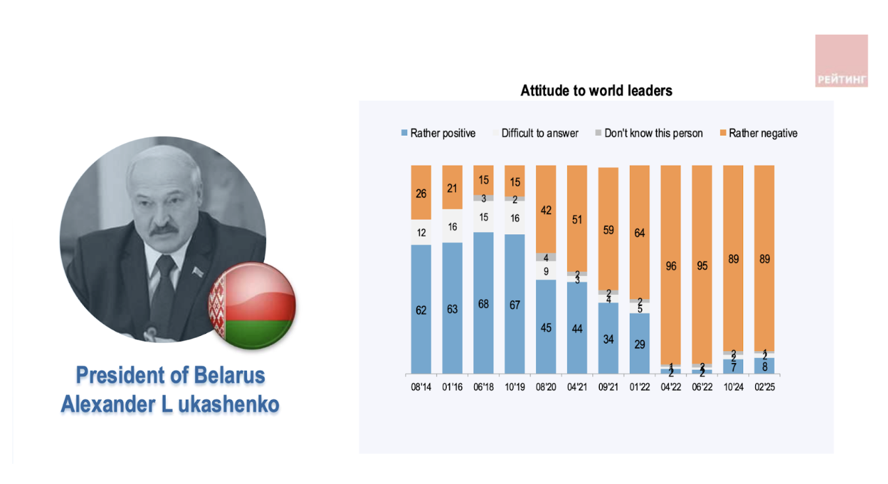 В 2023 и 2024 годах рейтинг доверия к Александру Лукашенко в Украине держался на уровне 7—8%. В начале 2025 года — незначительно подрос, однако общая динамика остается неизменной: по сравнению с довоенным периодом былая популярность политика сократилась почти в 10 раз.