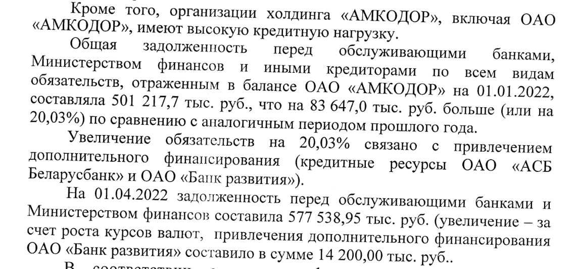 Несмотря на то, что в 2020-х «Амкодор» продолжал выводить на рынок новые модели и инвестировал в новые проекты, финансовая ситуация постепенно ухудшалась из-за все новых займов на модернизацию и текущую деятельность. В 2022 году управляющая компания холдинга имела около $200 млн долгов. [*] На этот же год приходилась выплата взятого в 2016 году государственного займа в размере $45 млн, из которых погасили лишь $500 тыс. — очевидно, что больше средств в бюджете компании на эти цели не было. [*]