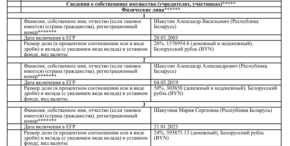 Передача акций в 2025 году не поставила точку в переделе империи Шакутина. В начале того же года он переписал доли в своих беларусских компаниях на жену и сына — что может свидетельствовать о попытке вывести эти активы из-под возможных финансовых претензий государства. [*] [*] [*] [*]