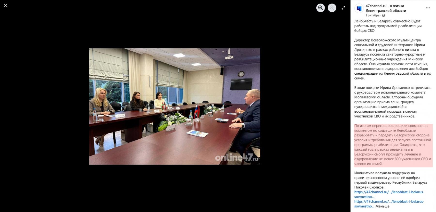 В это же время супруга Дрозденко Ирина, которая руководит Всеволожским Мультицентром социальной и трудовой интеграции, посетила санаторно-курортные учреждения Минской области и провела переговоры с руководством исполнительного комитета Могилевской области. В результате была достигнута договоренность о создании программы реабилитации для российских военнослужащих и их семей в беларусских санаториях. Планируется, что оздоровление в нашей стране ежегодно будут проходить не менее 800 человек. На каких условиях — это сейчас прорабатывает Комитет по социальной защите Ленинградской области. Инициативу уже одобрил Николай Снопков, о чем писали российские медиа, тогда как беларусские государственные СМИ этим планам внимания не уделили. [*]