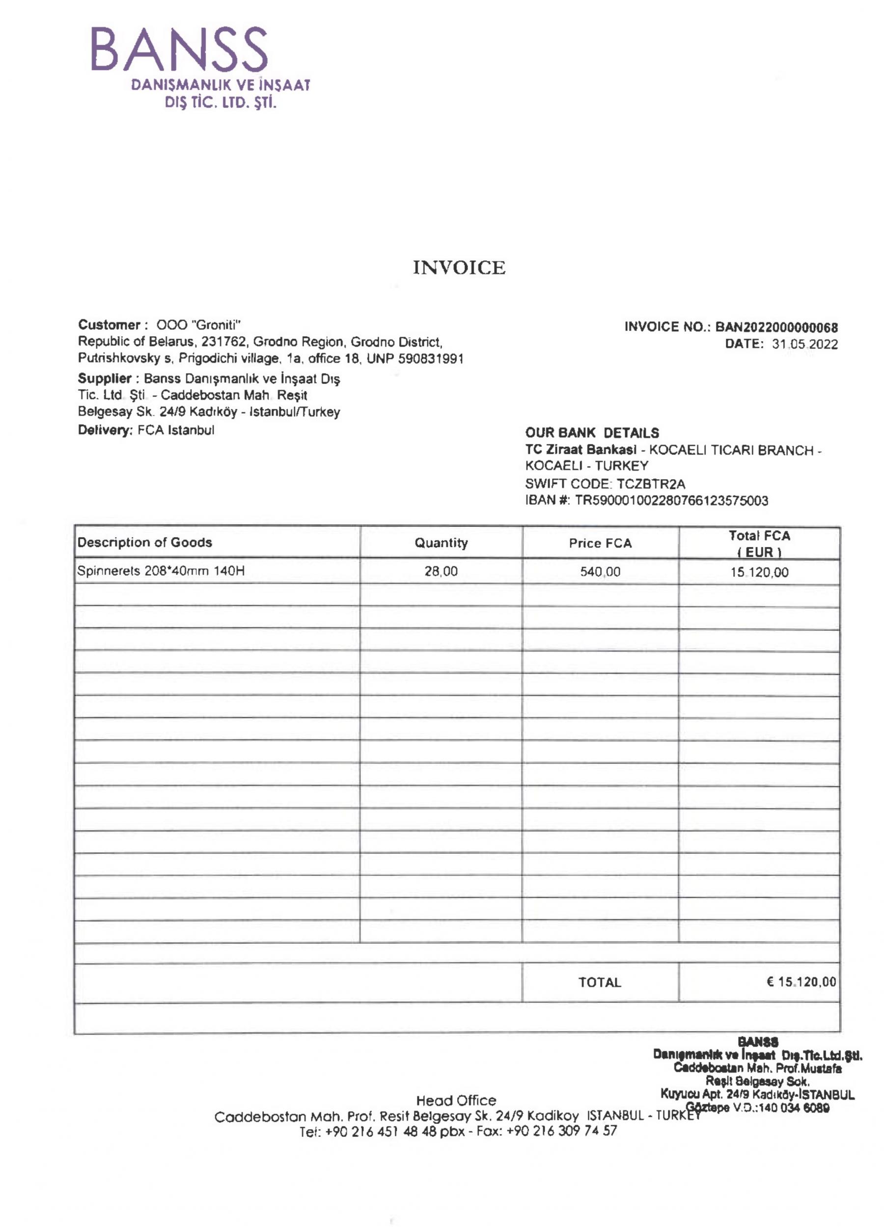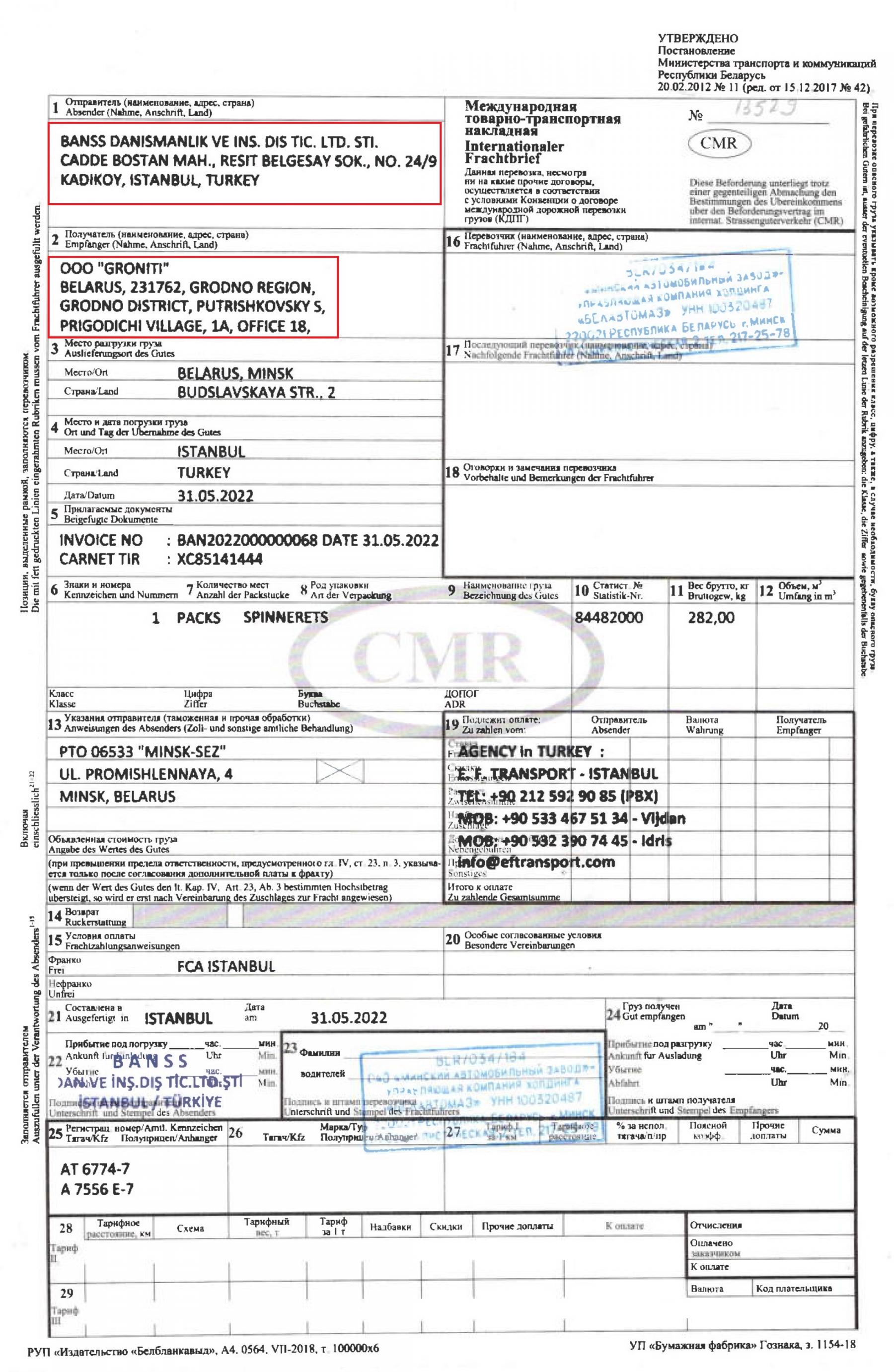 И другой способ нашелся. Из товарной накладной за май 2022 года, которую БРЦ получил от «Рабочего Руха», следует, что «Гродно Азот» все же приобрел фильеры, но через посредников. Первым была турецкая фирма Banss danişmanlik ve i̇nşaat diş ti̇caret li̇mi̇ted şi̇rketi̇. Она приобрела детали у Tetran и перепродала их ООО «Гронити» — знакомому нашим читателям по первой части этого расследования (компания поставляет в ЕС полиамид «Заводу Химволокно», филиалу «Гродно Азота», под видом своей продукции, помогая таким образом обойти санкции). [*] [*] [*] Наконец «Гронити» продала фильеру настоящему покупателю — «Гродно Азоту». [*]