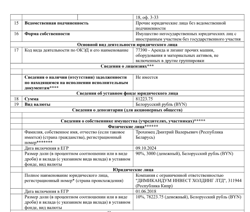 В 2024-м отправляли авто в РФ также два беларусских юрлица — ООО «НьюИнвестГрупп» и ООО «ЛегионГруппИнвест». Первое продолжило и в 2025-м. Оно с июня 2018-го по октябрь 2024-го полностью принадлежало фирме Dimicandum Invest Holding LTD (далее — Dimicandum), финансовым директором которой был Андрей Свиридов. Он же с июня 2024-го руководит «ЛегионГруппИнвест». [*] [*] [*] [*]