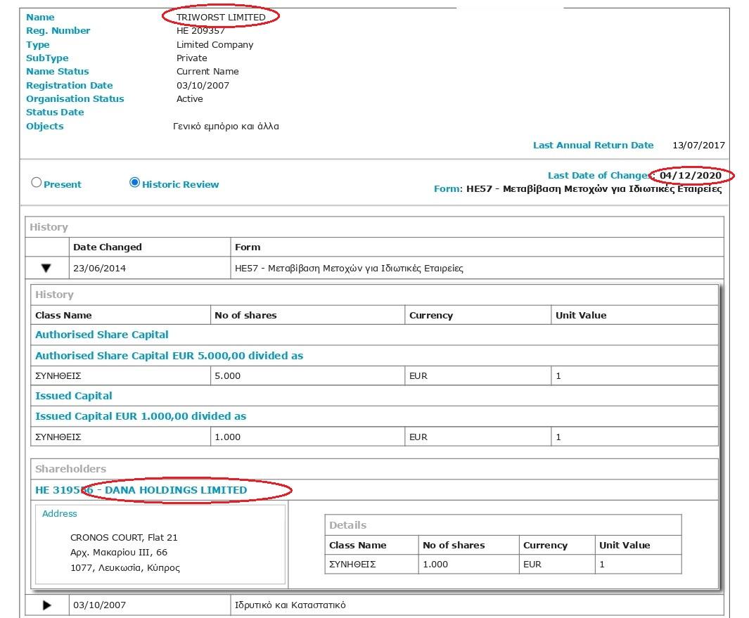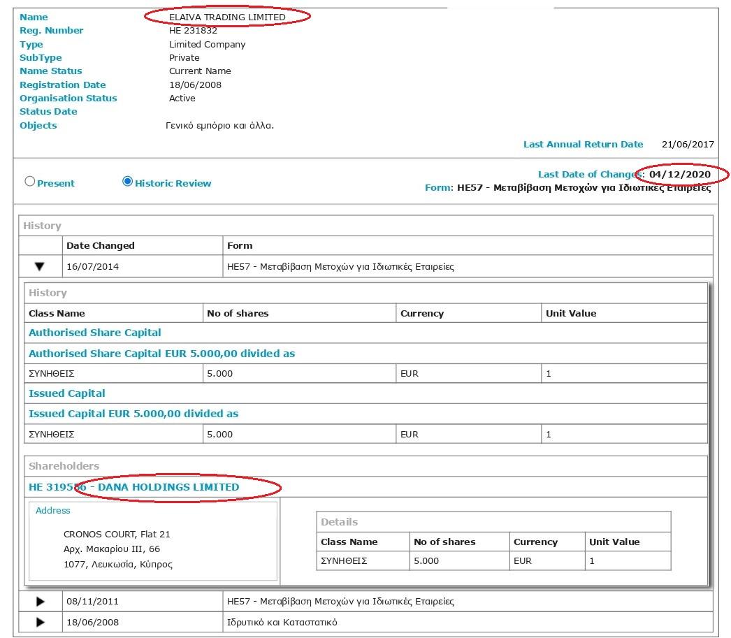 По документам фирмы «Дана Астра», «Эмирейтс Блю Скай» и «Дубай Ватерфронт» принадлежали сестре Боголюба Карича Оливере Неделькович и пяти кипрским офшорам (Triworst, Rodrick, Elaiva Trading, Ozalco Holding и Russelville), которые до 4 декабря 2020 года контролировались головной структурой Каричей на Кипре – Dana Holdings.